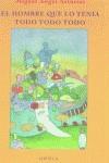 El Hombre que lo tenía todo todo todo es un derroche de fantasía en seis episodios en los que el Premio Nobel Miguel Ángel Asturias regresa a sus primeros escritos surrealistas. A lo largo de un argumento fantástico que da comienzo en la cama de sal del hombre que lo tenía todo todo todo y que continúa hasta el encuentro de éste con Chilabaco, el gran sapo que le abre su corazón, el lector viajará, subido en las zapatillas saltarinas, a través del tiempo y del espacio. E irá, de la Roma de los Papas al circo de Babilonia, y del exótico Egipto al bosque de los aguacatales, por un mundo mágico de milagros y caleidoscopios, de torres destruidas por estornudos y de juegos de palabras. El hombre que lo tenía todo todo todo se hace cada vez más rico, y como respira con dos grandes imanes escondidos en su espalda, capaces de atraer todo el oro del mundo, se convierte en el dueño absoluto de lo que le rodea. Pero sólo le falta cumplir un deseo: conseguir para su hijo la semilla del aguacate.