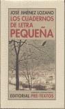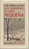 Titulo las notas que he podido salvar Los cuadernos de letra pequeña, sencillamente porque los seis o siete últimos cuadernos eran de pequeño tamaño, y mi letra muy comprimida por lo tanto. No tiene más significado el asunto, ni tampoco tiene otra intención la publicación de esta nueva selección de mis notas que la ya explicitada en los anteriores volúmenes. Si ahora estas notas siguen acompañando a algún lector, o le son útiles de algún modo, no habrá sido en balde su publicación; y, por mi parte, tengo que repetir, de nuevo, que me sentiré muy agradecido.