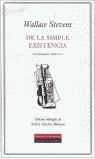 Wallace Stevens -escribe Andrés Sánchez Robayna- se abre a la sensibilidad contemporánea con la esencialidad que solicitamos a un poeta que, como él, fue heredero de las experiencias culminantes de la poesía moderna... De la simple existencia es un amplio recorrido por el conjunto de la obra de quien es considerado uno de los poetas más relevantes del siglo XX y una de las figuras más representativas del Modernism (es decir, de la modernidad literaria tal como se entiende en el ámbito anglosajón). En esta antología bilinge preparada por Sánchez Robayna recoge tanto algunos de sus poemas más conocidos -desde 'Mañana de domingo' hasta 'El emperador de los helados'- como aquellos otros poemas extensos en los que Stevens da completa libertad a la imaginación. El volumen se complementa con una amplia muestra de sus célebres aforismos (Adagia).