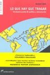 La agricultura y la pesca globalizadas han generado el expolio de los bienes naturales del Sur. Gustavo Duch defiende el Derecho a la Alimentación de los países más pobres, en apoyo a la organización de los agricultores de la Vía Campesina, y arremete contra la flagrante injusticia del sistema. Lo que hay que tragar cuestiona los monocultivos, la producción de agrocombustibles, la agricultura transgénica y demás tropelías que han despojado a los pequeños campesinos y pescadores de su fuente de trabajo, y que han reducido la biodiversidad. Subrayando las injusticias y atacando el capitalismo con sarcasmo, Gustavo Duch denuncia por su nombre los oligopolios de los alimentos: Pescanova, Calvo, Monsanto y Danone, entre muchos otros.