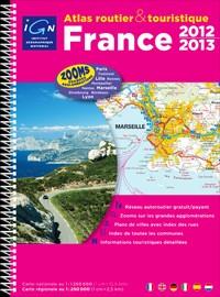 The France 2012/2013 Road & Tourist Atlas has towns or places of particular tourist interest marked and a range of symbols indicate the location of plenty of other points of interest, including airports, car ferries, religious buildings, castles, museums, antiquities, ruins, winter sports resorts, nature reserves, parks and tourist railways. Administrative boundaries (regions, departments and international borders) throughout France are marked out and colouring indicates national parks, built-up areas, industrial areas and woods. The maps use some relief shading and spot heights to show the topography and symbols depict plenty of landmarks.