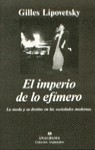 La moda cambia, pero sus explicaciones siguen siendo las mismas. Un problema aparentemente fútil, y sin embargo de una infinita complejidad, que se inserta en el centro mismo de la modernidad occidental. El objetivo primero de este libro es el de reinterpretar este problema en su totalidad. ¿Cómo entender la aparición de la moda en Occidente a finales de la Edad Media? ¿Cómo explicar la versatilidad de la elegancia, algo que no había sucedido en ninguna otra civilización? ¿Cuáles son los grandes momentos históricos, las grandes estructuras que han determinado la organización social de las apariencias? Tales son las preguntas a las que responde la primera parte del libro. Pero, hoy en día, la moda no es sólo un lujo estético y periférico de la vida colectiva, sino que se ha convertido en un elemento central de un proceso social que gobierna la producción y consumo de objetos, la publicidad, la cultura, los medios de comunicación, los cambios ideológicos y sociales. Hemos entrado en una segunda fase de la vida secular de las democracias, organizadas cada vez más por la seducción, lo efímero, la diferenciación marginal; la segunda parte del libro analiza la progresión de esta forma-moda y su repercusión respecto a la vitalidad de las democracias y a la autonomía de los individuos. Más allá de las inquietudes que pueda suscitar una sociedad abocada a la obsolescencia de las cosas y del sentido, la moda aparece, paradójicamente, como un instrumento de consolidación de la democracia, de las sociedades liberales, como un vehículo inédito de la dinámica modernizadora. Tal es la provocativa tesis del autor.