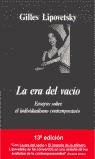 Se ha afirmado que estamos en la era posmoderna. Estallido de lo social, disolución de lo político: el individuo es el rey y maneja su existencia a la carta... "La era del vacío" ausculta esta mutación esencial, investigando los rasgos significativos de los tiempos actuales, tan alejados de la rebelión y el disentimiento característicos de los años de expansión. Este análisis, tan agudo como alejado de los clisés, se desarrolla a lo largo de seis estudios: «Seducción non stop», «La indiferencia pura», «Narciso o la estrategia del vacío», «Modernismo y posmodernismo», «La sociedad humorística» y «Violencias salvajes, violencias modernas». Nuevas actitudes: apatía, indiferencia, deserción, el principio de seducción sustituyendo al principio de convicción, generalización de la actitud humorística. Nueva organización de la personalidad: narcisismo, nuevas modalidades de la relación social, marcadas en particular por la reducción de la violencia y la transformación última de sus manifestaciones. Nuevo estado de la cultura, caracterizado por el agotamiento y derrumbe de lo que ha significado la vanguardia durante el último siglo. Gilles Lipovetsky atribuye el conjunto de estos fenómenos a un mismo factor: el individualismo es el nuevo estado histórico propio de las sociedades democráticas avanzadas, que definiría precisamente la era posmoderna.