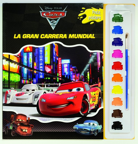 Encontrarás 20 pósters extraíbles que podrás colorear con las acuarelas y colgarlos donde quieras. Colorea a Rayo, Mate y tus personajes favoritos de Cars 2 en su aventura en el Grand Prix Mundial.