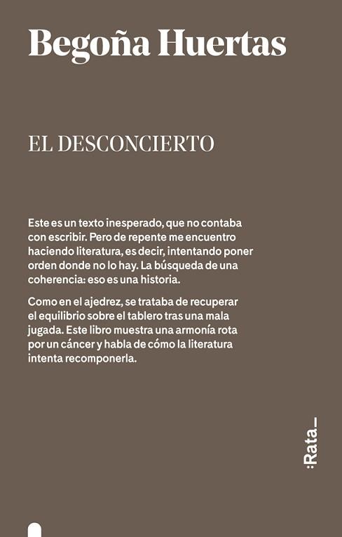 Cuando a la autora le diagnosticaron cáncer de colón, sintió una pérdida repentina de la estabilidad, como si un manotazo derribara todas las piezas de un tablero de ajedrez. El cáncer la había dejado sin guion, debía luchar contra ese cuerpo al que estaba atada y poner orden donde no lo había. Escrito en primera persona y a caballo entre el ensayo, la crónica y el diario personal, escribió un texto que alude a la confusión, al desequilibrio y al desorden emocional y físico que supone de pronto en una mujer joven encarar una enfermedad grave. El libro parte de una rigurosa investigación sobre los testimonios sobre el cáncer en la literatura, citando autores consagrados que en algún momento han escrito acerca de los conflictos y vaivenes emocionales de la enfermedad.