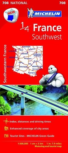 El Mapa National France Southwest, editado a escala 1/500 000, incluye índice de localidades, cuadro con las distancias, tiempos de recorrido y una selección de los lugares turísticos más importantes, extraídos de La Guía Verde. También incorpora códigos QR para ampliar la información en ViaMichelin.fr.