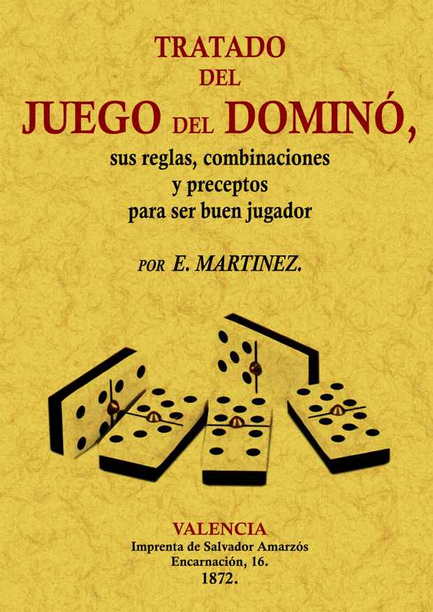 Completo tratado del juego del dominó escrito por E. Martínez en 1872 en el que al autor nos guía a través del juego, desde sus condiciones generales hasta las explicaciones de diversos casos en los que se debe tapar la salida del compañero, ahogarse el doble, taparse la última ficha, etc.