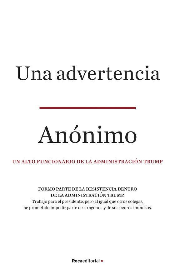 MÁS DE 350.000 EJEMPLARES VENDIDOS EN ESTADOS UNIDOS.EL LIBRO POLÍTICO DEL QUE TODO EL MUNDO HABLA.Un retrato sin precedentes de lo que sucede dentro de la administración de Donald Trump por parte de un alto funcionario anónimo de la Casa Blanca, cuyas primeras palabras de advertencia sobre el presidente sacudieron a Washington y al mundo entero.FORMO PARTE DE LA RESISTENCIA DENTRO DE LA ADMINISTRACIÓN TRUMP.Trabajo para el presidente, pero al igual que otros colegas, he prometido impedir parte de su agenda y de sus peores impulsos.El 5 de septiembre de 2018, el New York Times publicó un artículo de opinión explosivo garantizando el anonimato de su autor. Descrito como «un alto funcionario dentro de la administración Trump», su autor explicaba que era testigo visual del caos dentro de la Casa Blanca, de la inestabilidad de la administración y de cómo la gente trabaja para controlar los impulsos temerarios de Donald Trump.