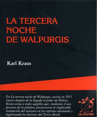 El aterrador pronóstico que del Tercer Reich hace Kraus en La tercera noche de Walpurgis se revela como un vaticinio de lo que habrían de ser los horrores de la Segunda Guerra Mundial y el Holocausto. Redactada entre mayo y septiembre de 1933, La tercera noche de Walpurgis debió aparecer en la revista Die Fackel (La antorcha) en el otoño de ese mismo año. Pero el escrito permaneció inédito, pues su publicación hubiera podido poner en riesgo vidas humanas, entre ellas las de varios amigos suyos. Por otro lado, quizás tampoco fue para el autor una obra definitivamente acabada, pues Kraus, que había dedicado meses de trabajo a la tentativa de ?comprender el suceso y la fuerza que lo mueve?, se fue dando cuenta cada vez más de la dificultad, y acaso la imposibilidad, de dominar la ?abundancia de formas de esa tercera noche de Walpurgis? que a diario prometía nuevas y cada vez peores fechorías, y de lograr alguna vez ?en la ?carrera de la sátira contra el asunto??, un momento y un punto de vista donde la tentativa desesperada de describir lo indescriptible se hubiese podido detener y concluir. Como ya dijera el propio Kraus en 1932 en su obra Hüben und Drüben, en el caso de que Hitler tomara el poder ?se iniciaría una barbarie que, con la pacotilla prescindible de una cultura conspicua, sepultaría todos los valores y hasta la misma vida que los crea?.