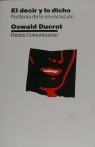 El decir y lo dicho reúne, convenientemente modificados y actualizados, diversos trabajos del autor escritos entre los años 1968 y 1984, relativos a los problemas lingüísticos de la enunciación. En ellos se intenta dejar bien asentado que el sentido de un enunciado () no sólo incluye alusiones al acontecimiento histórico constituido por la aparición del enunciado, sino que no es otra cosa que un comentario del decir. Dentro de este marco se inserta una concepción de la enunciación, esbozada en la primera parte de la obra y desarrollada de manera sistemática en los últimos capítulos de la compilación. Lo que el enunciado dice acerca de su decir es que se trata del lugar en que se expresan diversos cuya pluralidad no puede ser reducida a la unicidad del , fundamento -hasta ahora nunca cuestionado- de las más diversas teorías lingüísticas. La determinación de esa pluralidad deriva hacia una indagación sobre los diferentes estatutos atribuidos a estos sujetos, sobre su carácter necesario o arbitrario y sobre la manera en que están marcados en la organización gramatical de la fase.