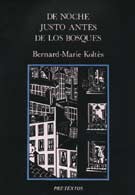 DE NOCHE JUSTO ANTES DE LOS BOSQUES. . Bernard-Marie Koltès. . traducción de José María Marco. . . El joven al que Koltès hace hablar, en este texto ´trata de retener junto a sí, utilizando todas las palabras de las que dispone, a un desconocido al que ha
